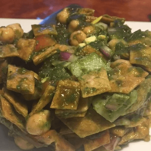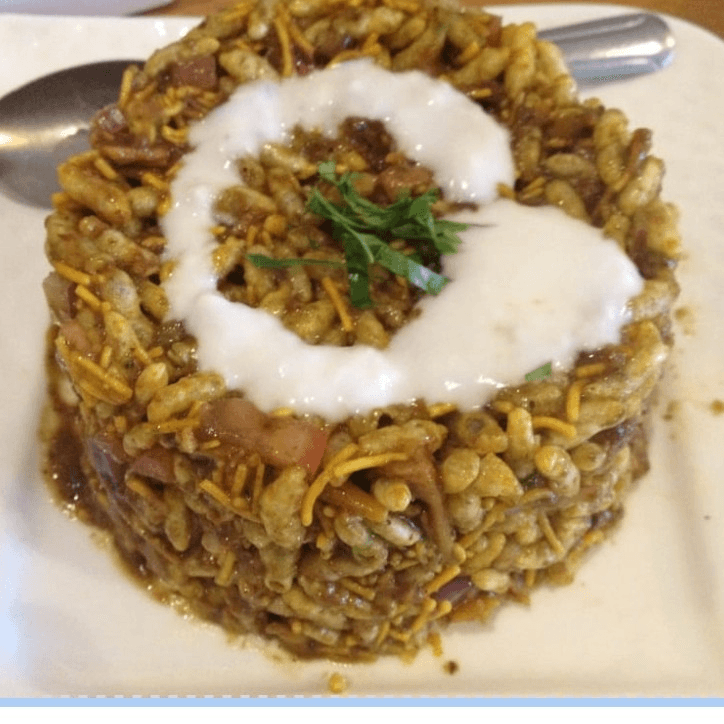 Puff rice, crisps, lentil, vermicelli, tomato, onion, chili, cilantro, mix with tamarind and mint chutney and topped with yogurt.