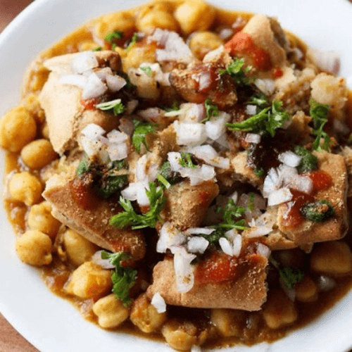 Seasoned potato samosas mixed with chickpeas, tomatoes, onions, chutneys, yogurt and spices.