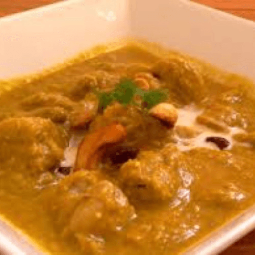 Boneless cubes of chicken cooked with fruits in onion cashew based sauce with a touch of cream Served with rice