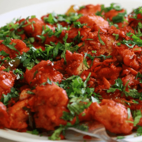 A fiery battered cauliflower cooked with onions, garlic and spices in a soy sauce